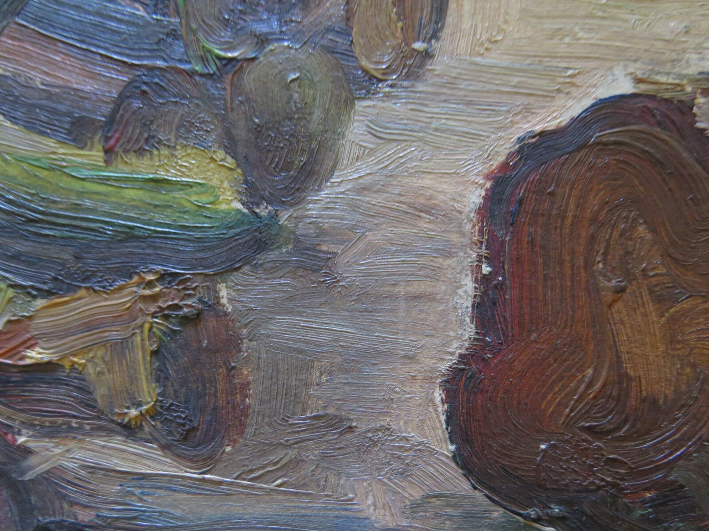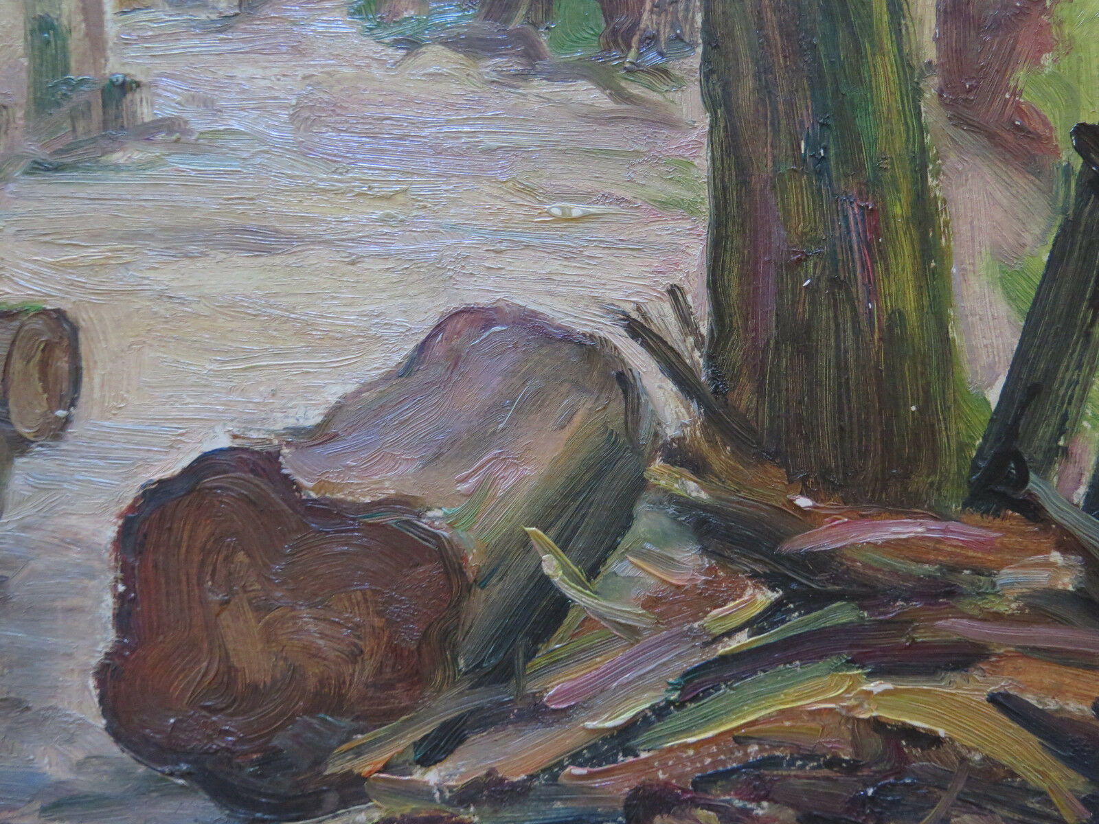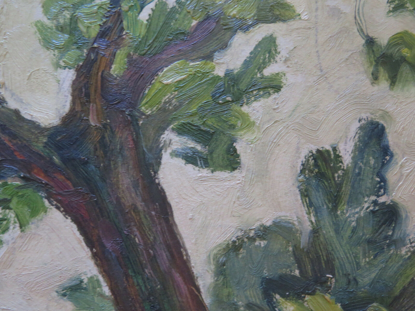 Antico dipinto ad olio su tavola raffigurante un paesaggio della campagna emiliana in estate, opera dell'artista Gaetano Pancaldi (1922-2014).