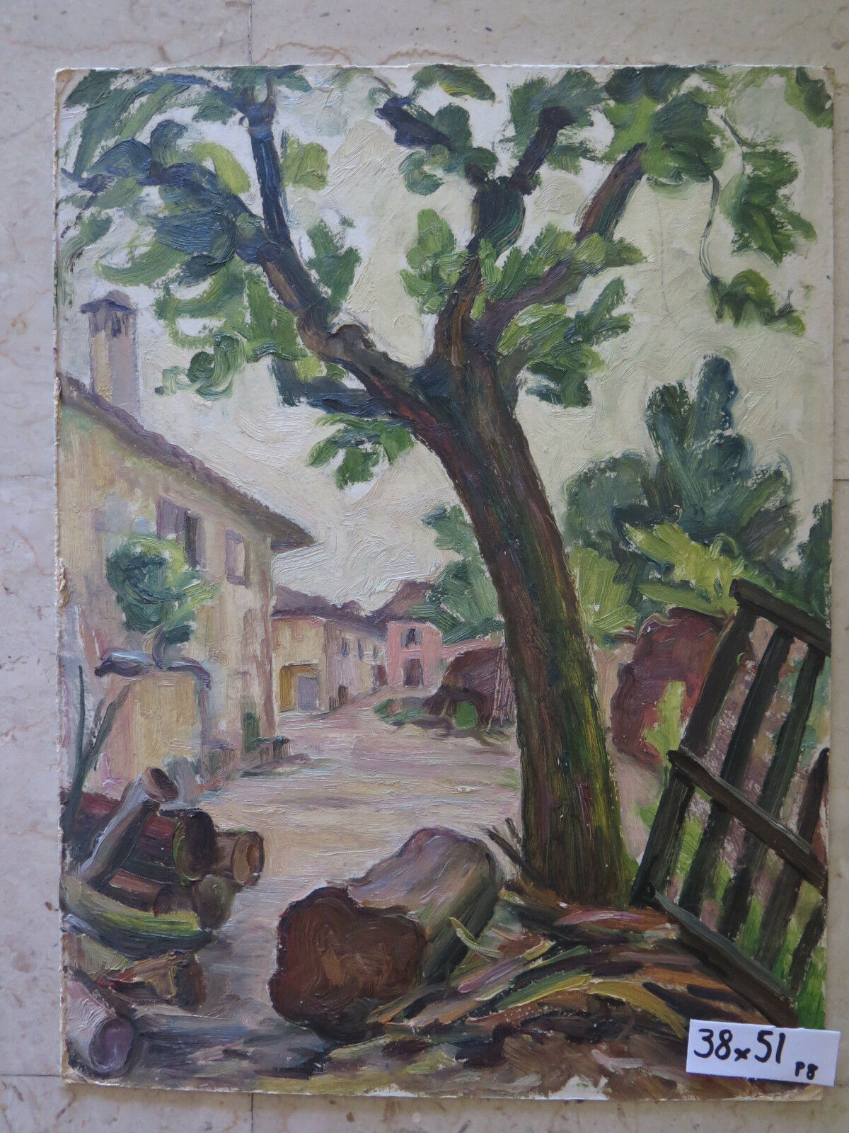 Quadro antico dipinto ad olio su tavola veduta del cortile