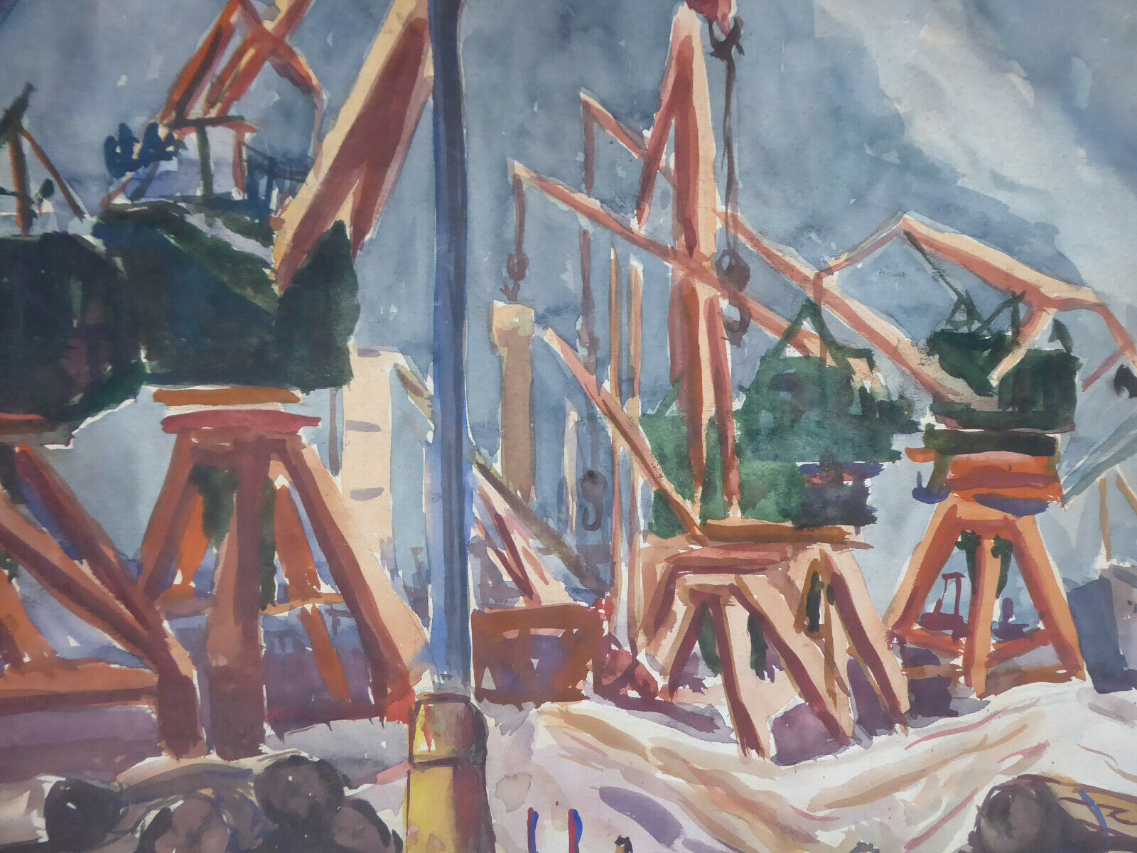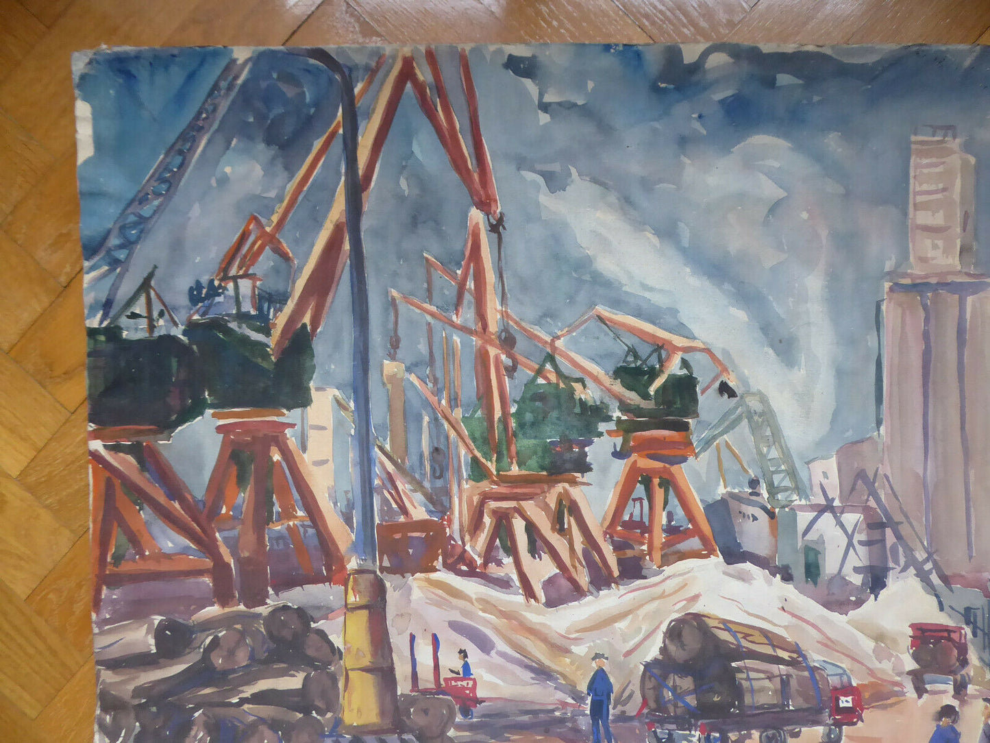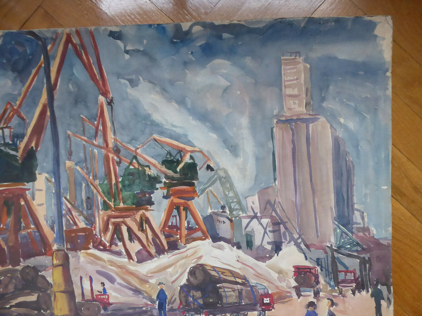 Lavori in corso a Madrid, grande dipinto datato '73 che raffigura un cantiere in piena attività con gru, camion ed operai al lavoro.